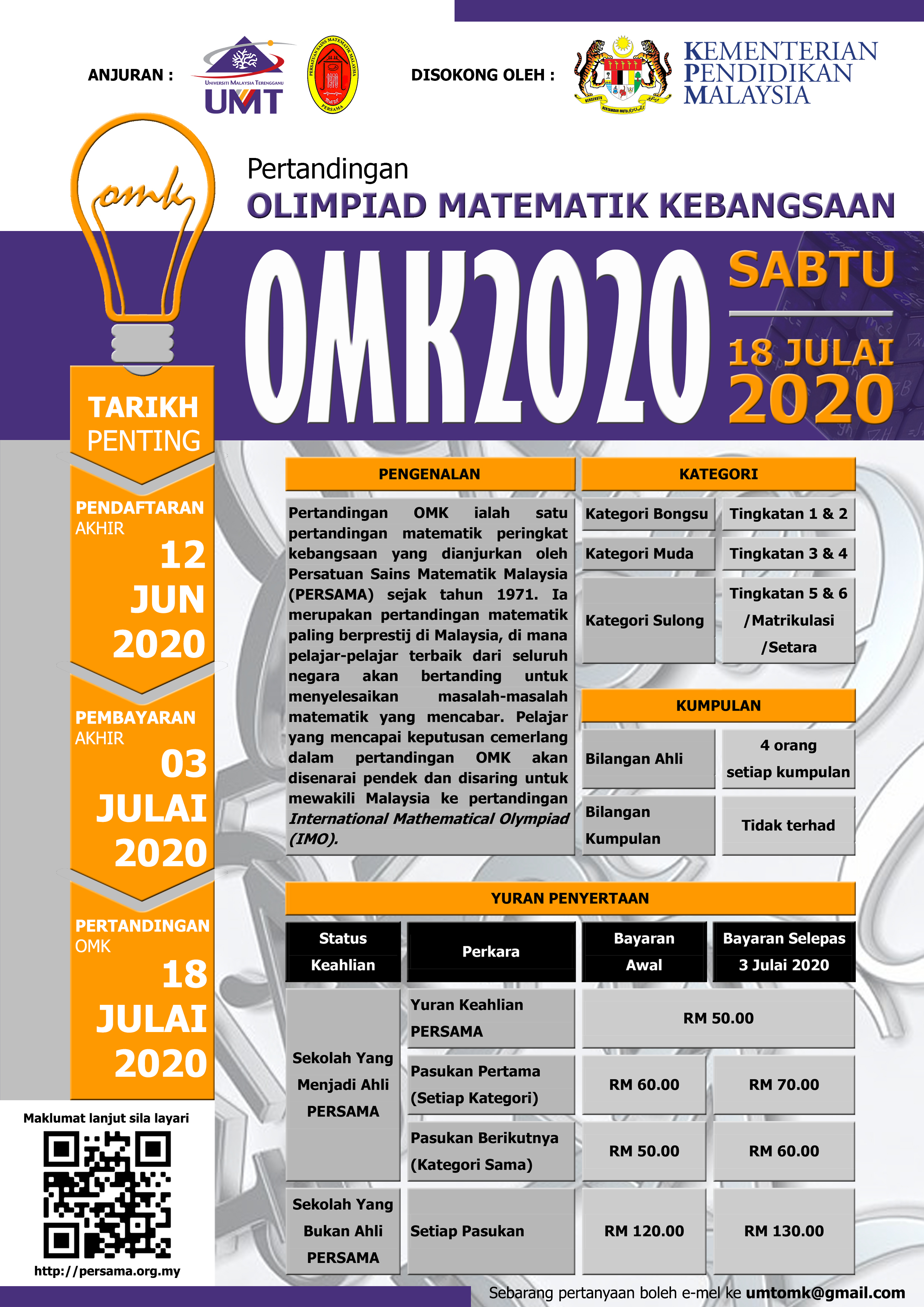 2. Sukacita dimaklumkan bahawa pertandingan Olimpiad Matematik Kebangsaan (OMK) yang diiktiraf di peringkat kebangsaan oleh Kementerian Pendidikan Malaysia (KPM) dan merupakan aktiviti tahunan kelolaan Persatuan Sains Matematik Malaysia (PERSAMA) akan diadakan seperti butiran berikut: