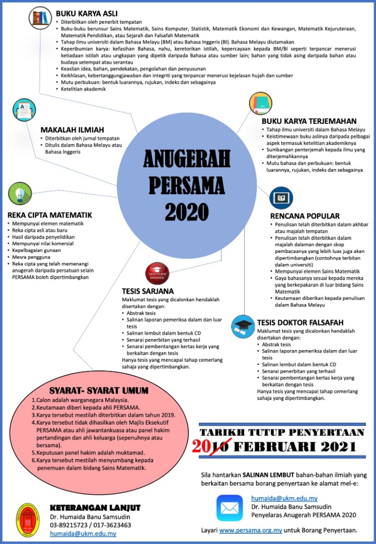 Merujuk kepada perkara di atas, sukacita dimaklumkan bahawa pihak Persatuan Sains Matematik Malaysia (PERSAMA) telah membuka semula pencalonan untuk Anugerah PERSAMA 2020.