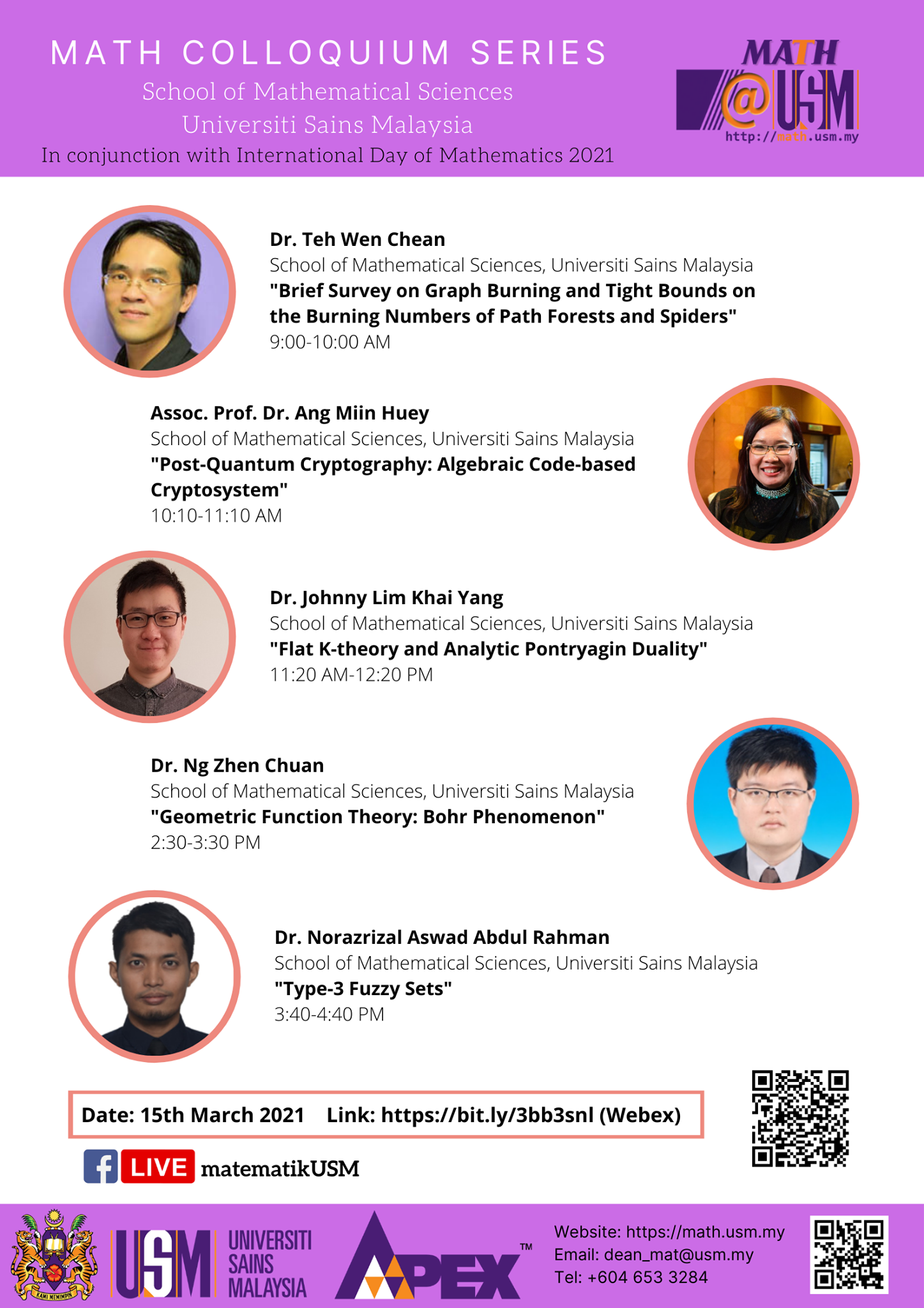 In conjunction with the International Day of Mathematics 2021, we cordially invite everyone to attend the Math Colloquium Series by School of Mathematical Sciences, Universiti Sains Malaysia on 15th March 2021.