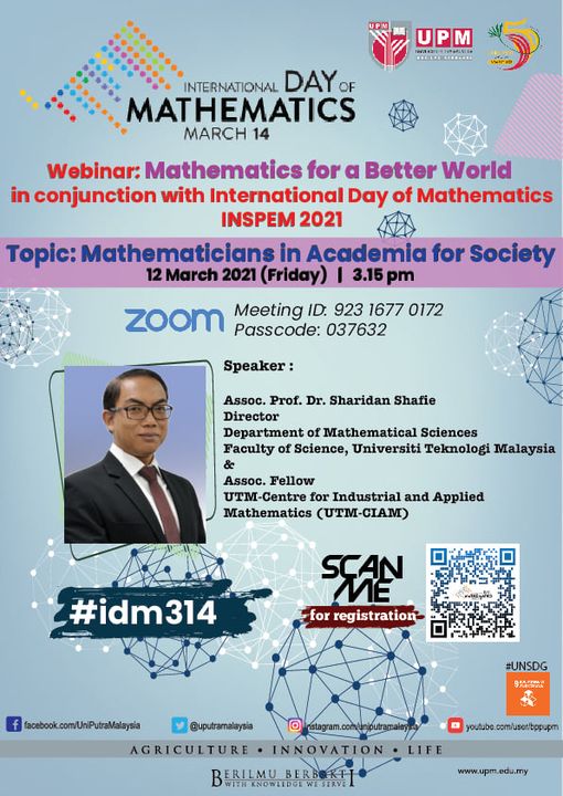 To all researchers, lecturers and students, We are pleased to inform the INSPEM's Webinar Mathematics for a Better World in conjunction with International Day of Mathematics 2021 will be held as follows: