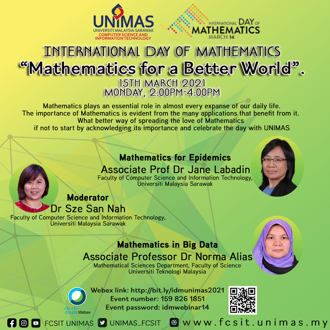 This year, the Faculty of Computer Science and Information Technology through their Mathematical-based undergraduate programme, the Computational Science Programme will also join in the celebration by organizing some talks and forum. As this year the date falls on Sunday, the faculty will have the event on the 15th March 2021 virtually via the Webex platform at 1400 hrs (GMt +8)