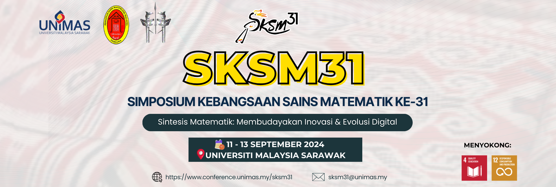 Sukacita dimaklumkan bahawa Simposium Kebangsaan Sains Matematik yang Ke-31 (SKSM31) akan diadakan pada 11 hingga 13 September 2024. SKSM merupakan program tahunan Persatuan Sains Matematik Malaysia (PERSAMA) dengan kerjasama Universiti Awam di Malaysia. Pada tahun 2024, Universiti Malaysia Sarawak (UNIMAS) berkolaborasi dengan PERSAMA untuk menganjurkan Simposium Kebangsaan Sains Matematik yang Ke-31 (SKSM31). Simposium ini menghimpunkan cendekiawan Sains dan Matematik dalam negara dan luar negara bagi membentangkan hasil penyelidikan terkini. Ianya bertujuan untuk memperkasakan Sains Matematik dan aplikasinya, menerusi perhimpunan dan perbincangan idea inovatif di kalangan ahli akedemik dan pakar-pakar saintis, penyelidik di seluruh negara yang terlibat dengan Sains Matematik.