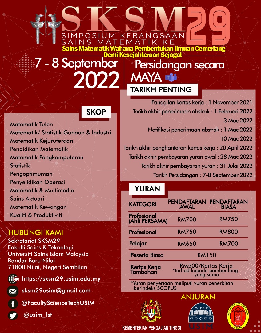 Simposium Kebangsaan Sains Matematik ke-29 Maklumat lanjut boleh didapati daripada laman web SKSM29 (sila klik).